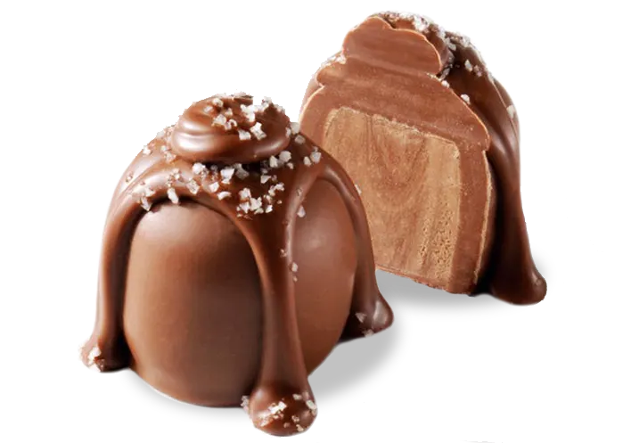 Luscious caramel blends with milk chocolate ganache center dipped in milk chocolate, drizzled with dark chocolate and sprinkled with sea salt.